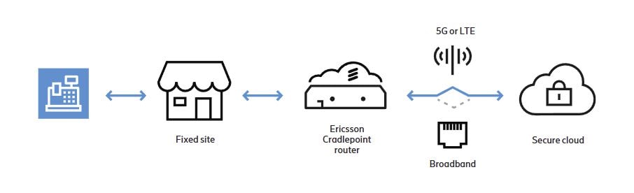 Immediate connectivity through cellular: Ericsson Cradlepoint’s all-in-one routers come with integrated high-performance 5G or LTE modems, removing the necessity to wait for wired connections. These routers create a secure cellular link as the main connection, ensuring immediate connectivity at new sites. Companies can launch on time, free from network-related delays.